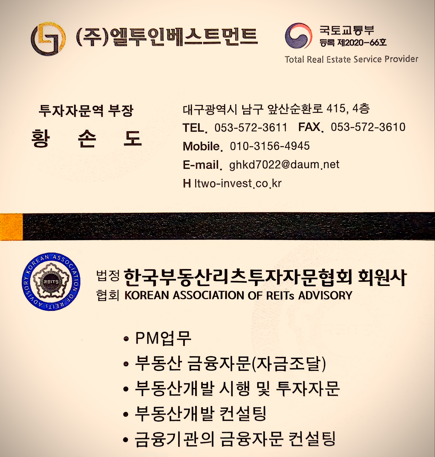 대한민국 부동산 금융자문 기업 (주)엘투인베스트먼트 자문역 부장 황 손도입니다.