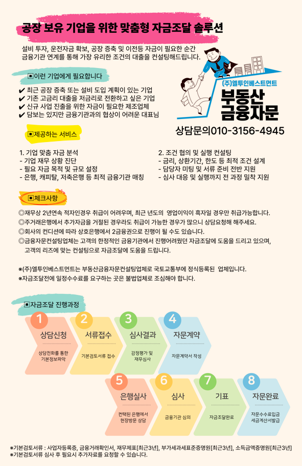 | 전국 제조업 공장담보대출 운전자금 및 시설자금 최대한도 80% 특판행사 (0) | 2025.03.15 |