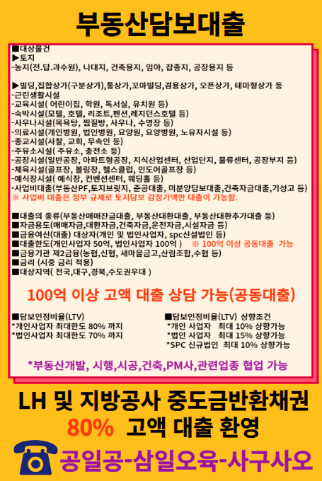 한국토지주택 공사( LH) 또는 지방 공사 공공기관 토지분양 중도금반환채권 대출 1,000억 이상 고액 대출 가능합니다. (0) | 2024.02.27 |